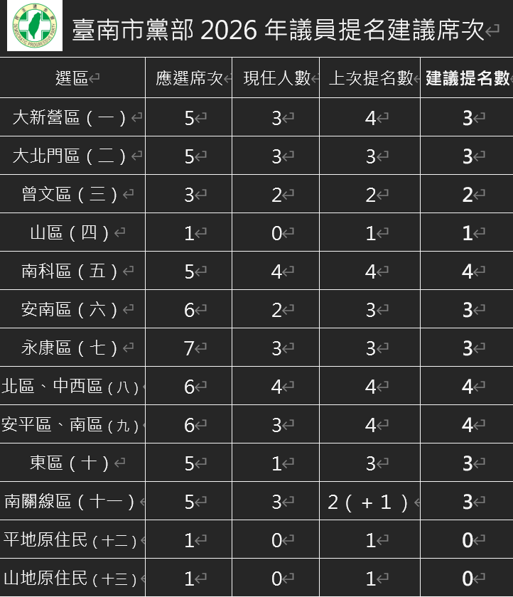 為提早備戰2026年地方大選,團結因應當前情勢,民進黨臺南市黨部通過各選區議員提名建議席次。針對提名策略與相關考量因素,台南市黨部主委郭國文立法委員表示,第一、以議會過半為最大目標;第二、評估部分選區人口結構變動因地制宜;第三、綜合考量應選席次變動、本黨現任人數以及上次提名人數參酌。此外,為擴大原住民族服務量能,原住民提名將採取合作關係,考量選民結構,評估暫不提名。經執行委員充分討論後,秉持公平、公正、公開原則,部分選區建議提名席次雖有進行調整,惟仍以維持現任席次為基礎,尋求擴大版圖為目標,持續深化民主首都理念,團結爭取市民鄉親支持,將呈報黨中央依程序審議後正式通過。