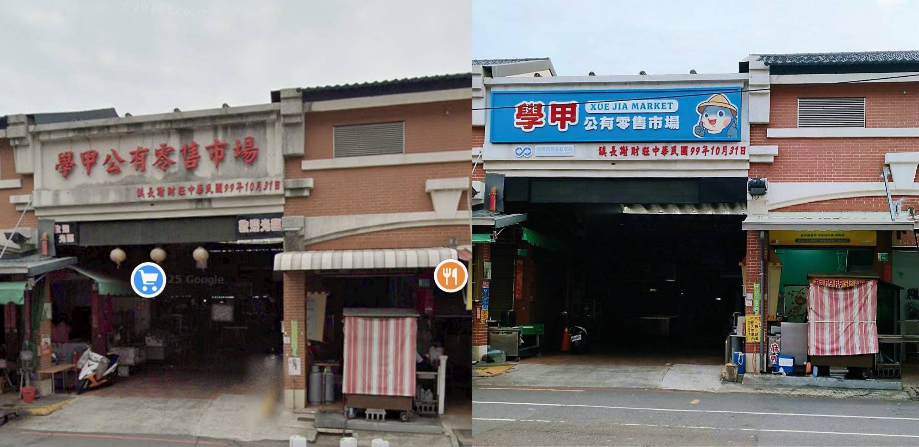 左為風災前,右為風災後,攤舖商使用慰助金更換招牌、雨遮等生財器具