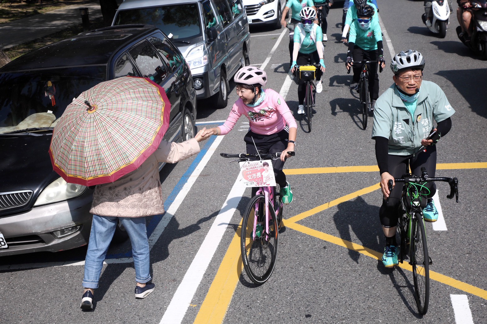 在烈日之下,陳亭妃與蔡旺詮騎著腳踏車沿街拜票,不時向民眾揮手致意、請託支持。蔡旺詮也向市民朋友懇請,在3月9日至13日的電話民調中,給予「唯一支持」。
