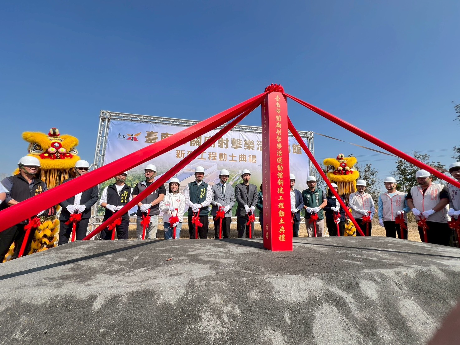 為打造健康運動幸福城市,提供民眾優質、舒適、安全的運動環境,運動部及臺南市政府共同斥資 1.9 億元興建「臺南市關廟射擊樂活運動館」,並於今(16)日隆重舉行動土典禮。由台南市副市長葉澤山代表市長黃偉哲出席、體育局長陳良乾、運動部長李洋、關廟區區長陳必成及多位地方民意代表、體育界人士共同執鏟動土,祈求工程平安順利,預計將於116年底完工。