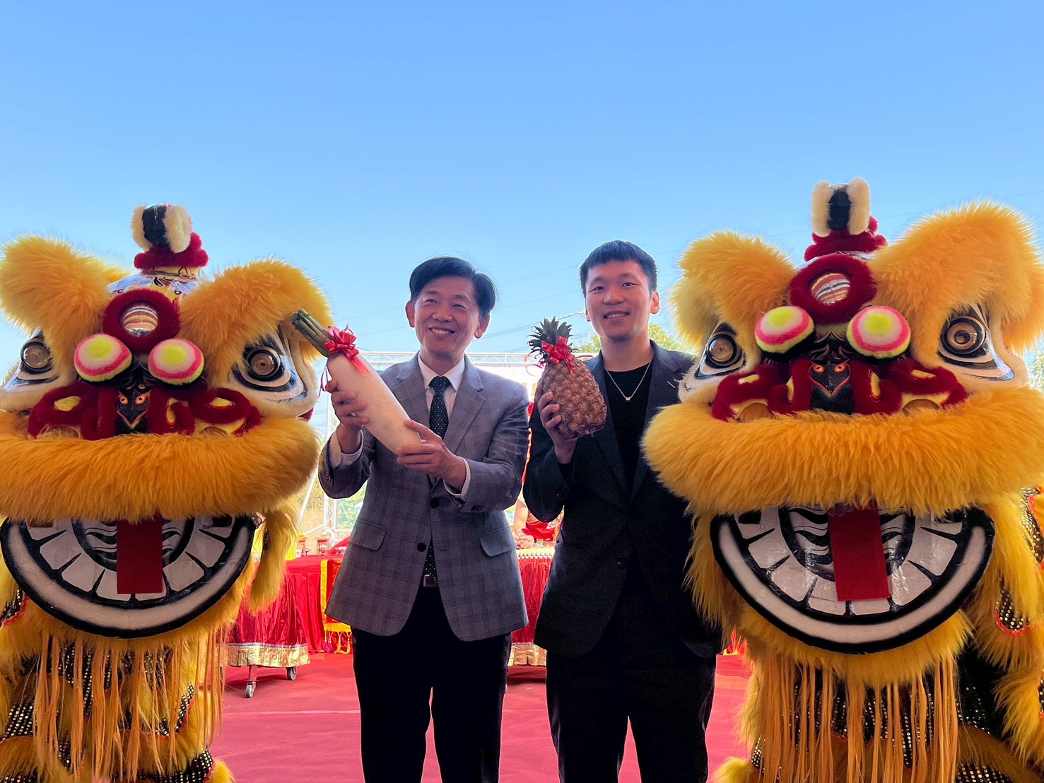 ▲副市長葉澤山及運動部長李洋接受舞獅獻菜頭與鳳梨象徵好采頭。(體育局 提供)