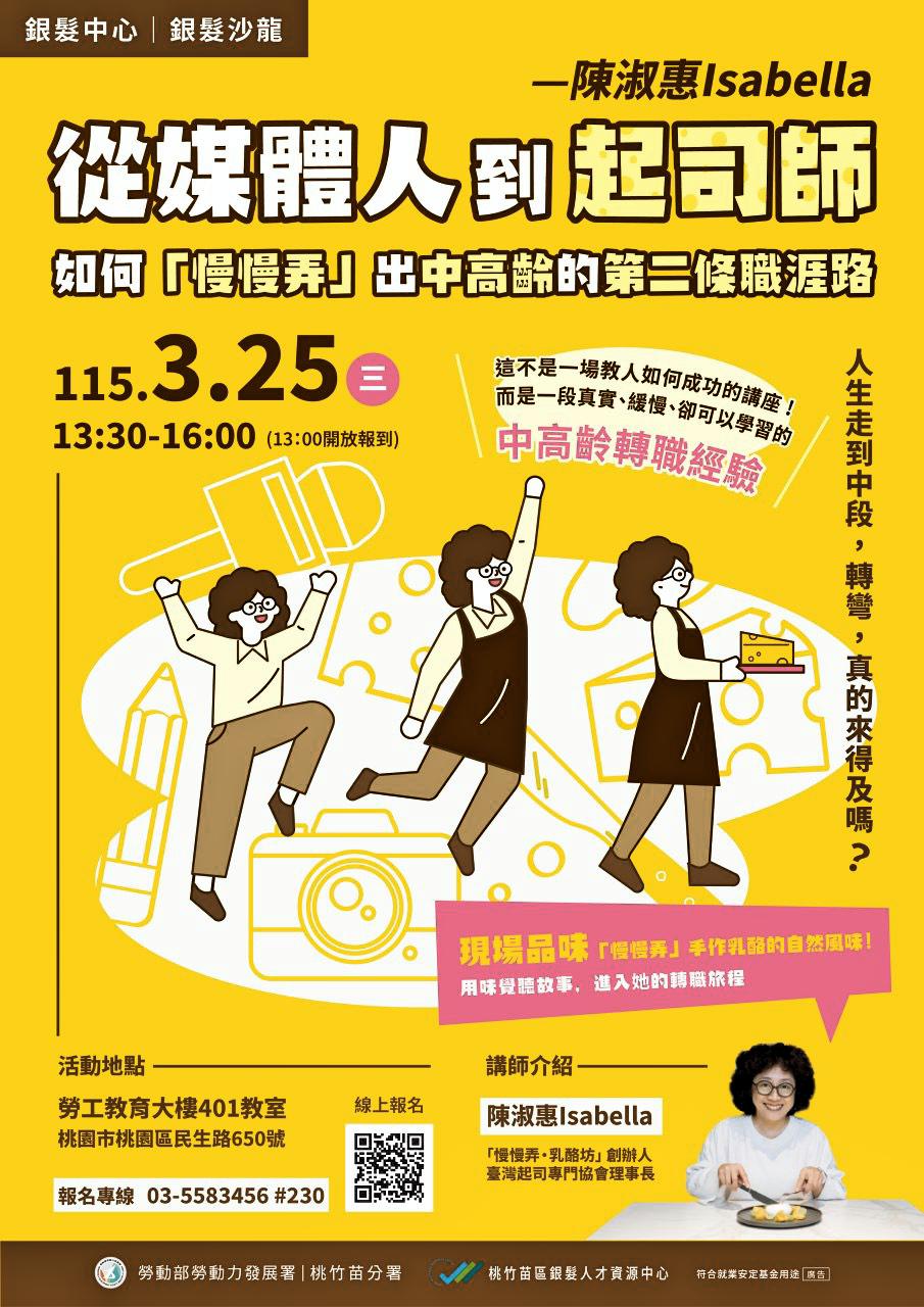 許多中高齡者在職涯轉彎時,面對不確定的未來,很難跨出第一步,桃竹苗分署銀髮人才資源中心為協助更多中高齡朋友突破瓶頸,此次講座以「也許我不是不能,只是還沒開始」為主軸,邀請「慢慢弄乳酪坊」創辦人陳淑惠老師,分享她如何在人生中段從熟悉的媒體界轉身,跨海修習全新專業技能,並成功創業的歷程,透過陳淑惠老師真實的轉職故事與對談分享,讓參與者看見不同人生階段的可能性,激發再就業與自我實現的勇氣,傳遞「年齡不是限制,而是資本」的核心理念。此外,活動現場也將透過輕鬆互動的方式,向民眾宣傳銀髮就業資源,提升民眾對政府推動中高齡就業相關措施的認識。