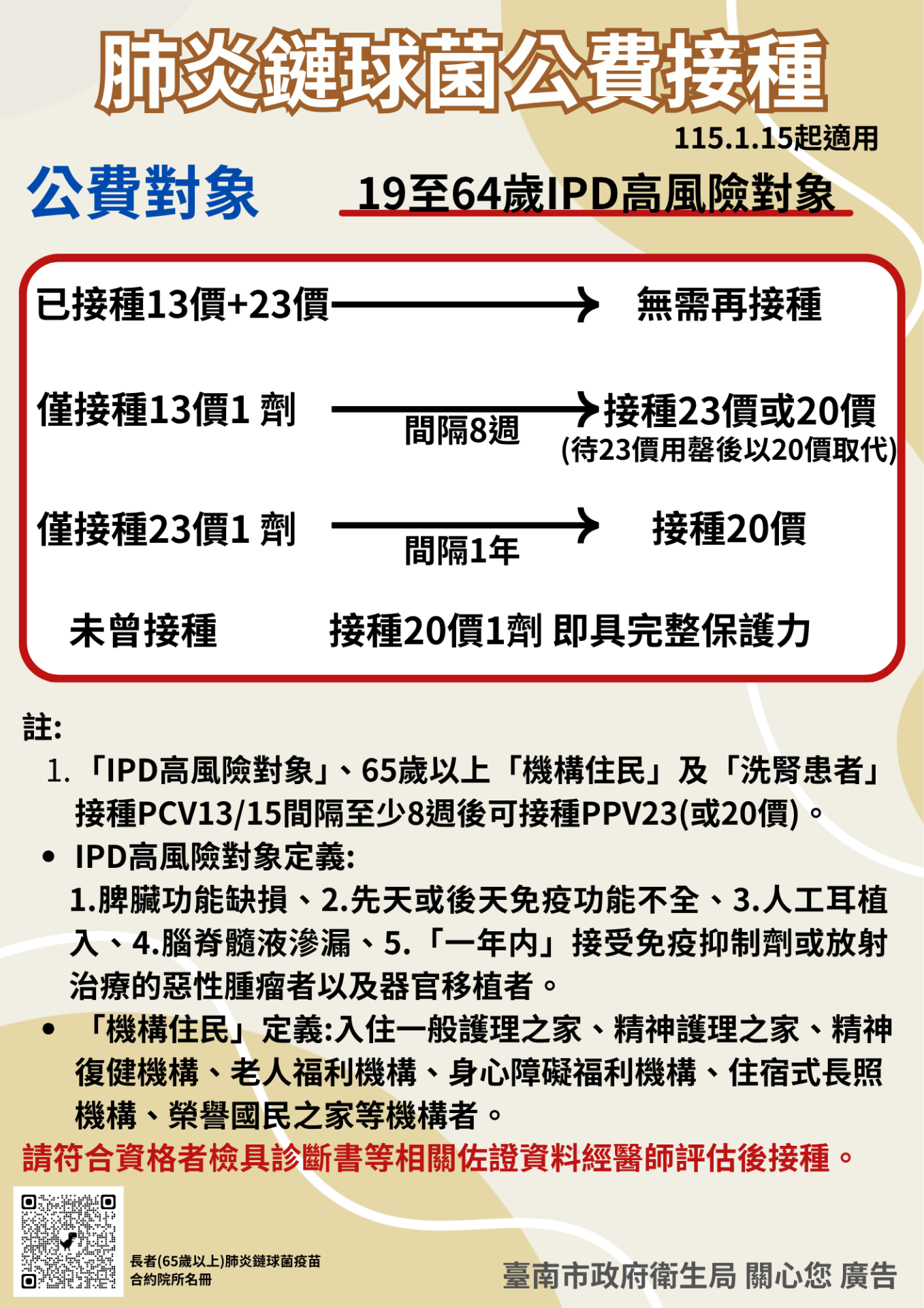 公費接種對象包括:65歲以上長者、55至64歲原住民,以及19至64歲高風險族群(如免疫功能不全、脾臟功能缺損、器官移植等)。