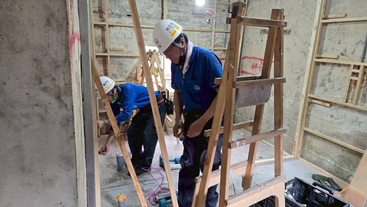 修繕工程採跨工會分工接力方式辦理,前期由泥水工會進行屋頂拆除作業,並由連景企業協助搭設安全鷹架;電子加工工會於3月底完成鐵厝搭建,鋁製品工會接續進行門窗丈量與安裝。清明連假期間,木工工會與電氣工會志工進場施作天花板輕鋼架、室內裝修及管線配置,並自二手家具倉庫搬運雙人及單人床架及床墊、衣櫥與桌椅等生活家具入厝,全面提升居住安全與生活機能。這次因修繕地點於郊區,餐飲工會亦貼心號召志工現場提供熱騰騰午餐。