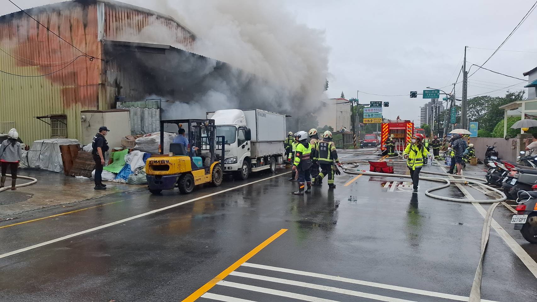 桃園市樹仁三街倉庫火警消防隊員前往灌救。翻攝畫面